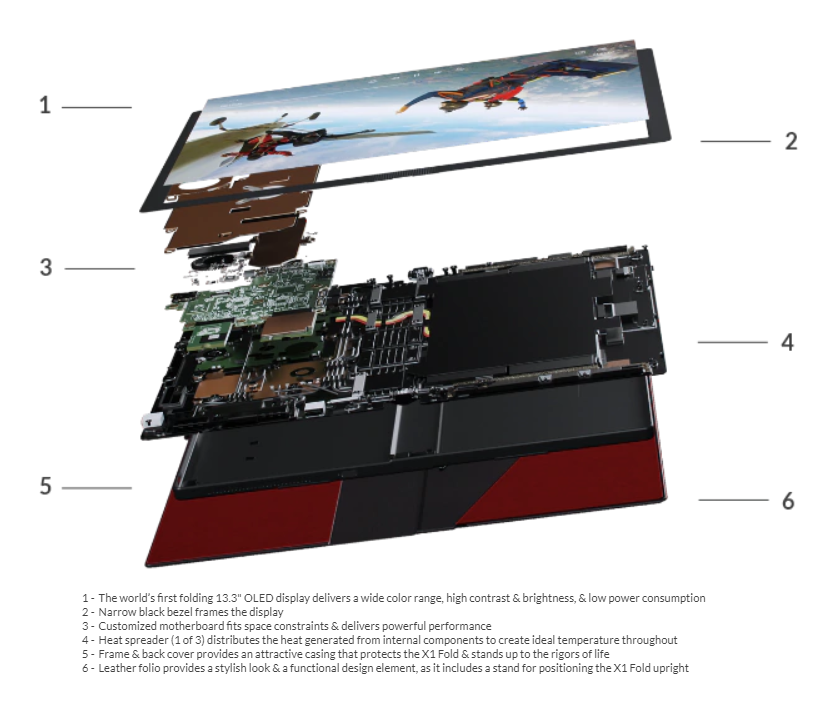我从官网找来了爆炸图,可以看到机器主要分为了左右两个部分,中间有大量空间被铰链占用,左侧为主板区域,右侧主要为电池设计,如此一来实现了左右折叠。