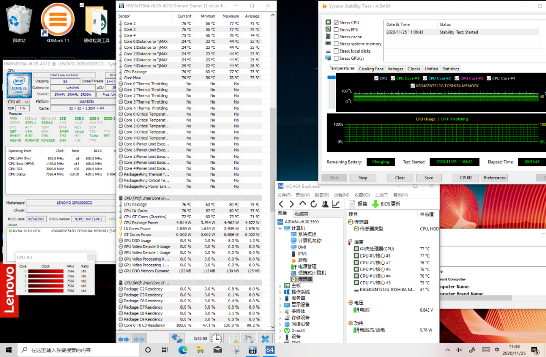 在满载状态下,CPU温度最高80℃,维持在76℃,功耗4.8W,频率维持在1.8GHz满睿频,图中主频显示错误,但倍频是正确的。