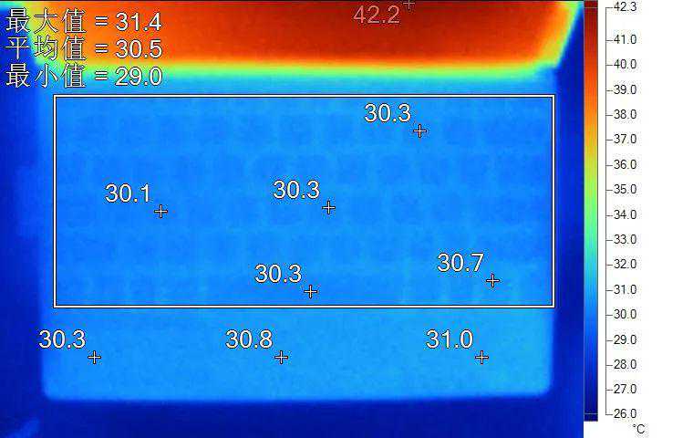 表面温度如上图所示,由于键盘可拆卸且远离热源,整个键盘面的温度都很低,只有30℃左右。