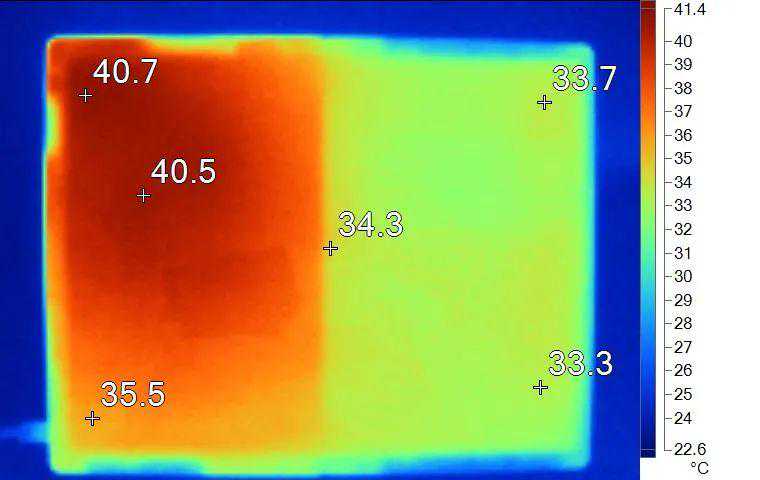 相比之下,这台电脑的最高温度出现在屏幕上,中央温度达到了42.3℃,最高温度43.4℃。