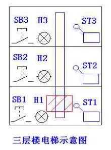 电梯的上升、下降由一台电动机控制;正转时电梯上升、反转时电梯下降。各层设一个呼叫开关(SB1、SB2、SB3)、一个呼叫指示灯(H1、H2、H3)、一个到位行程开关(ST1、ST2、ST3)。