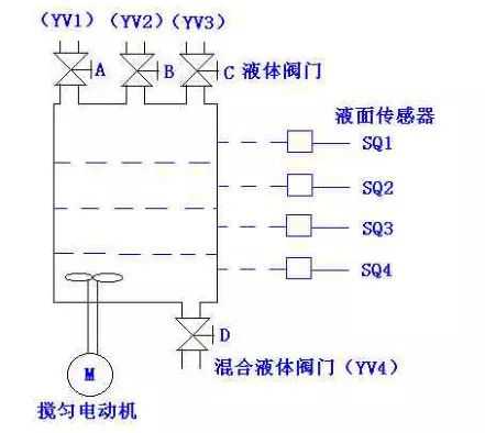 多种液体自动混合装置的PLC控制如图所示为三种液体混合装置,SQ1、SQ2、SQ3和SQ4为液面传感器,液面淹没时接通,液体A、B、C与混合液阀由电磁阀YV1、YV2、YV3、YV4控制,M为搅匀电动机,其控制要求如下: