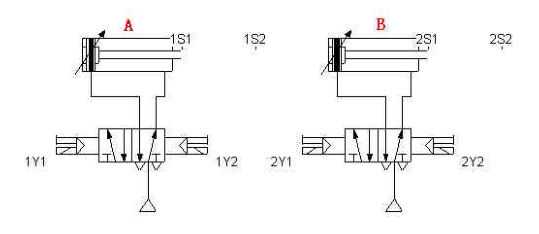 设计程序,使两个气缸顺序动作,其顺序为:A1B1B0A0。