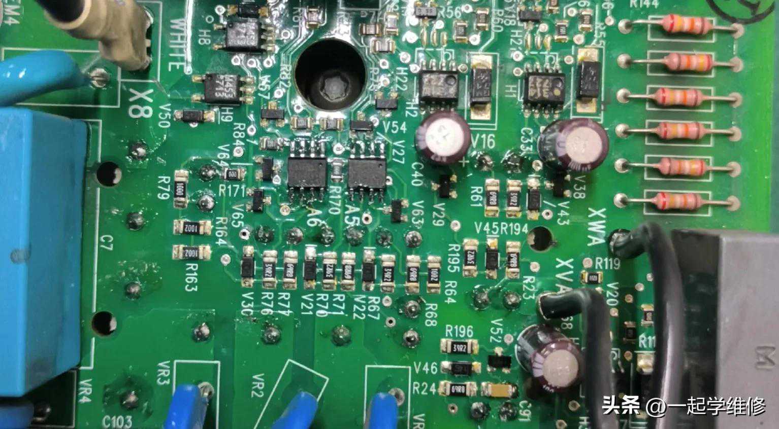 经拆除整流逆变模块后,进一步测量六路门极触发电路发现驱动芯片,稳压管,电阻,贴片电容等电子元器件存在击穿和变值现象。
