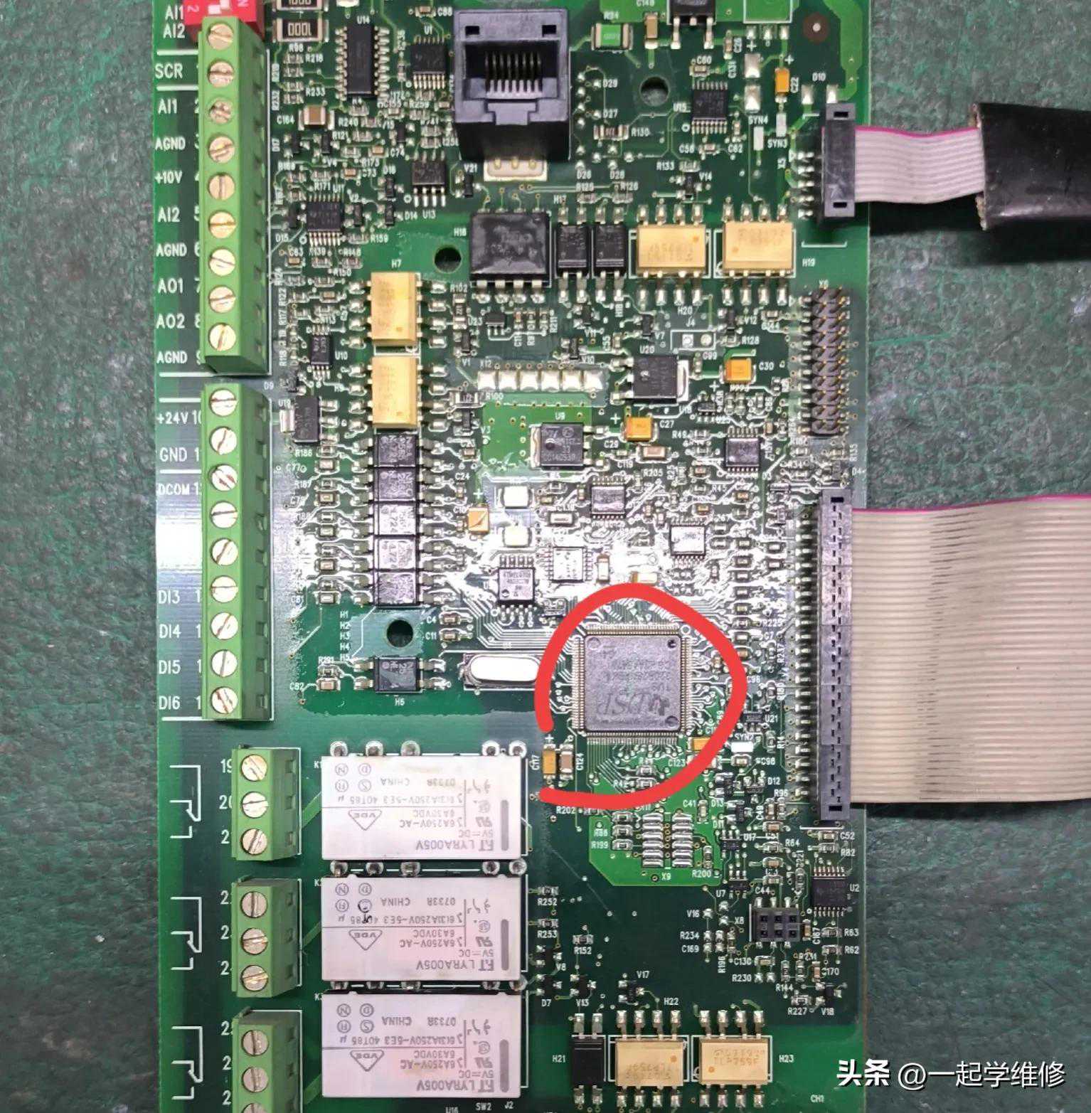 上图红圈内DSP芯片短路,此DSP芯片的供电是经稳压器U9,转换而来。但在变频器异常炸毁时,产生电流冲击,电压波动异常升高,主板3V电源保护电路缺失,最终导致DSP芯片击穿短路,通电后此DSP芯片有异常发热现象。