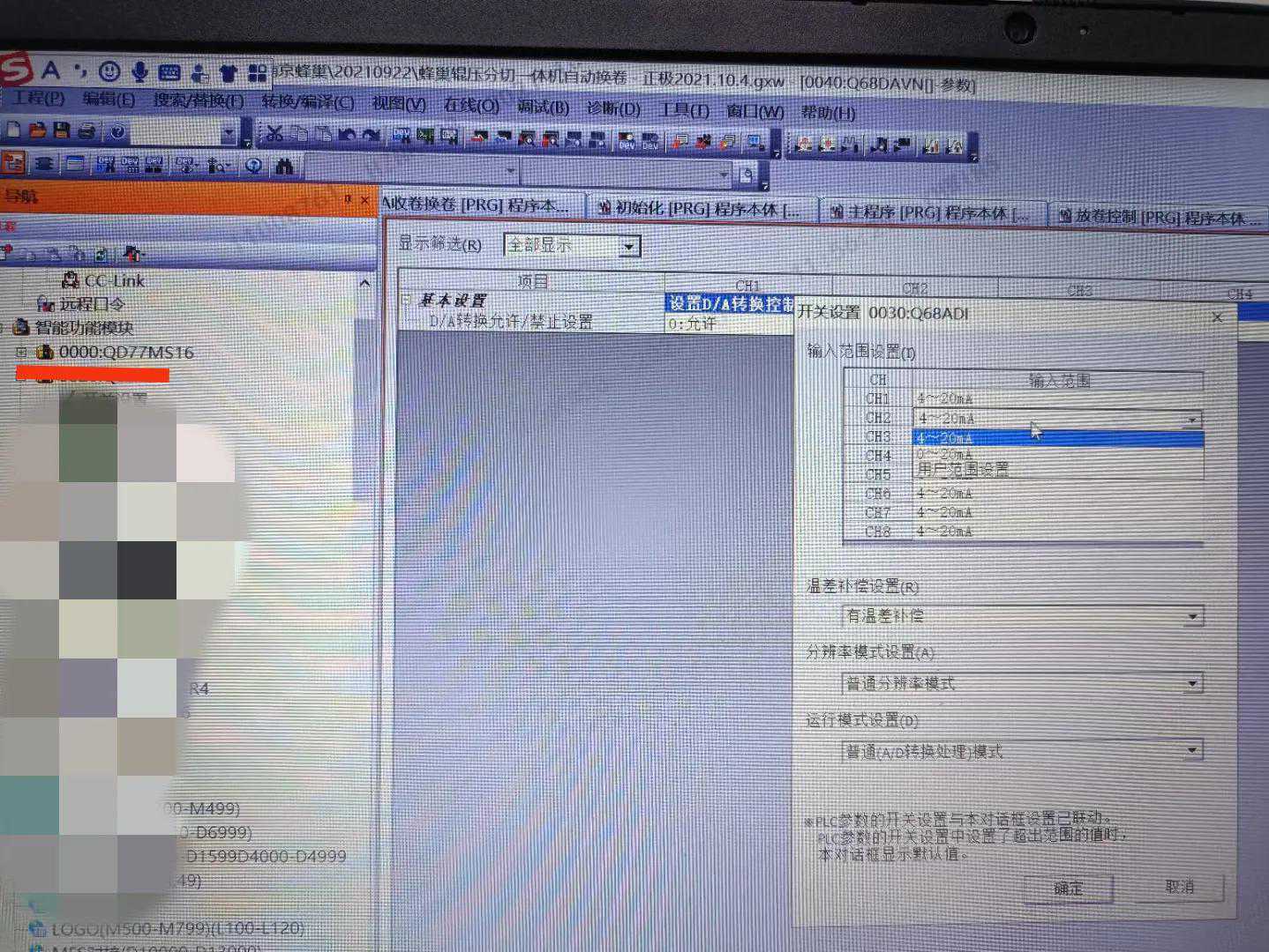 Q68ADI开关设置输入范围和分辨率设置,低分辨(0-4000),高分辨率(0-16000),在自动刷新处指定数字值输出地址。