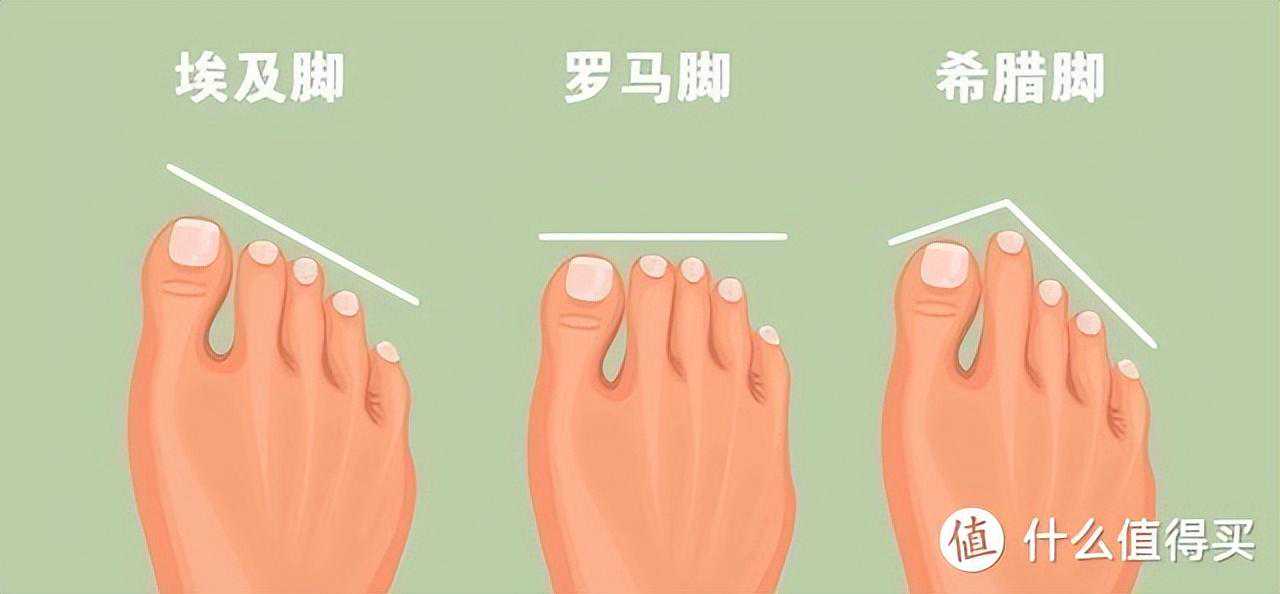 1、清楚自己是什么脚型通常,按照脚型分类,地球上的人们大概可分为希腊脚、埃及脚和罗马脚三类(如图1所示),而亚洲人大多以埃及脚为主,这种脚型的特点就是大拇指最长,其他脚趾依次递减,呈一条斜线。