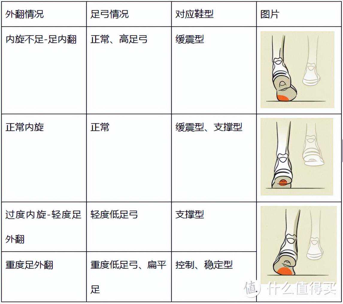 5、足弓类型、跑步时的内旋状况及对应跑鞋类型,参见图5;