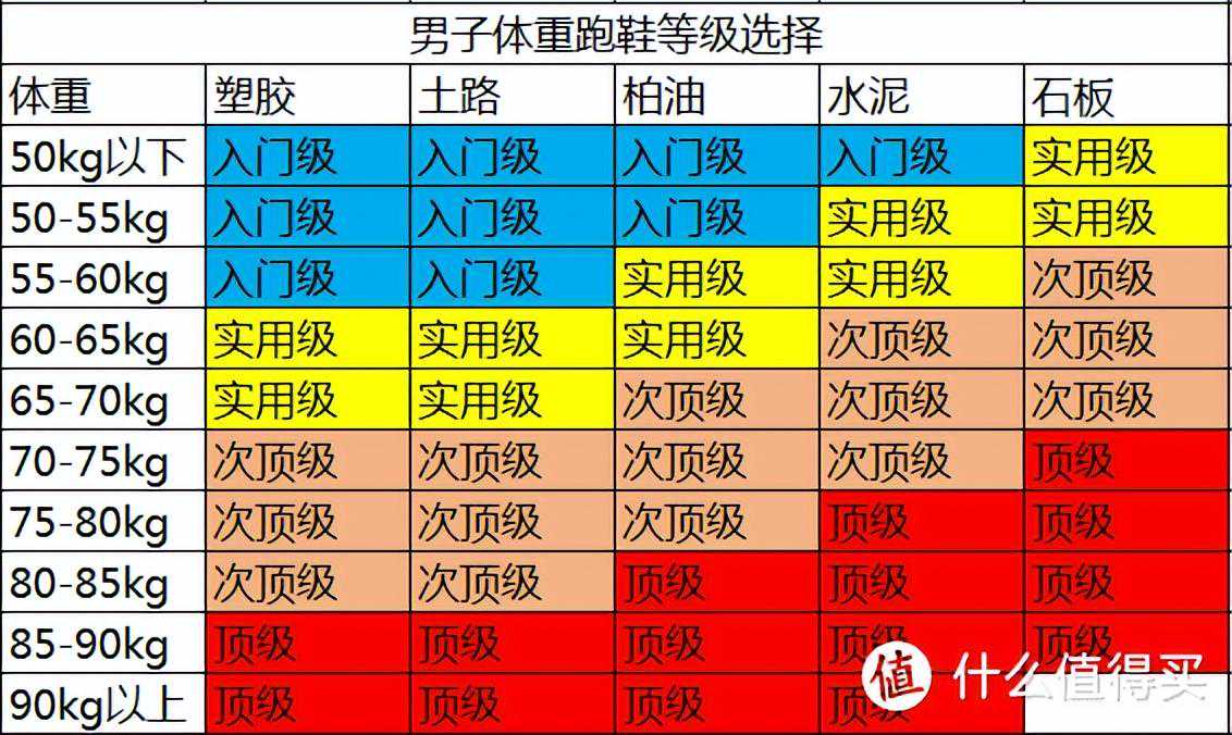6、根据自己的体重选择对应等级的跑鞋通常以亚瑟士男子/女子体重跑鞋等级选择表为参考,对于国产跑鞋也基本同样适用,参见图6、7。