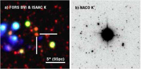 这本质上是根据现在,往前追溯。在海量的高精度照片中寻找那个消失的星星曾经的图像。这方面,天文学家们早在十几年前就有了丰富经验,他们已可以游刃有余地根据超新星爆发后的图景去寻找它过去的身姿。下图为SN2008bk爆发后(右),天文学家从VLT过去拍摄的图像中找到它的“前身”的图像(左),它是一个红超巨星。