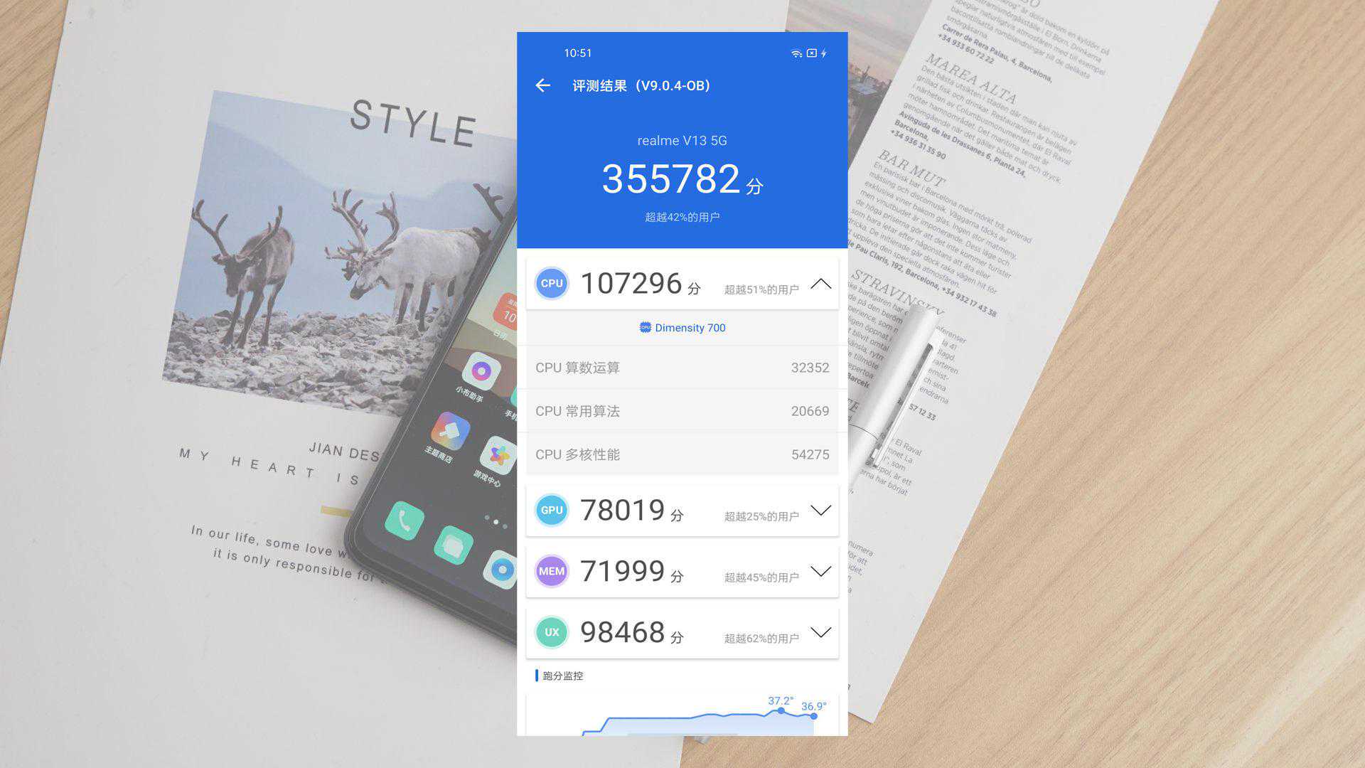跑分方面,实测接下来我们借助安兔兔软件对realme真我V13的整机性能进行了测试,可以看到该机获得了35万多的总分,成绩超越了42%的其他用户,其中CPU部分的得分尤为出色,达到10.7万分,超越了51%的其他用户,总的来说,在这个价位段的机器里,真我V13的表现还算不错。