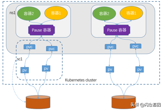 提示:使用sc动态创建pv,对应pvc必须也是属于对应的sc;上图主要描述了用户在创建pvc时,引用对应的sc以后,对应sc会调用底层存储系统的管理接口,创建对应的pv并关联至对应pvc;