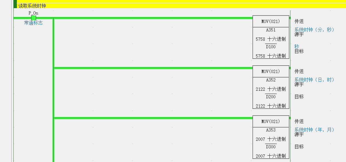 欧姆龙PLC系统时钟地址:A351:高8位地址中存储的数据是“分钟”;低8位存储地址中存储的数据是“秒钟”A352:高8位地址中存储的数据是“日”;低8位存储地址中存储的数据是“小时”A353:高8位......