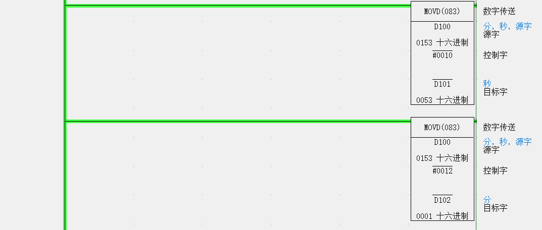 用MOVD位移指令,将D100中的低8位传送到D101中,高8位传送到D102中