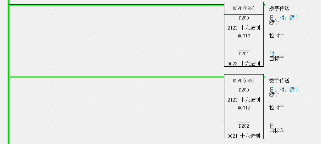 用MOVD位移指令,将D200中的低8位传送到D201中,高8位传送到D202中
