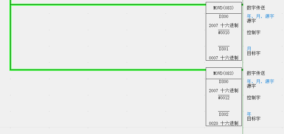 用MOVD位移指令,将D300中的低8位传送到D301中,高8位传送到D302中