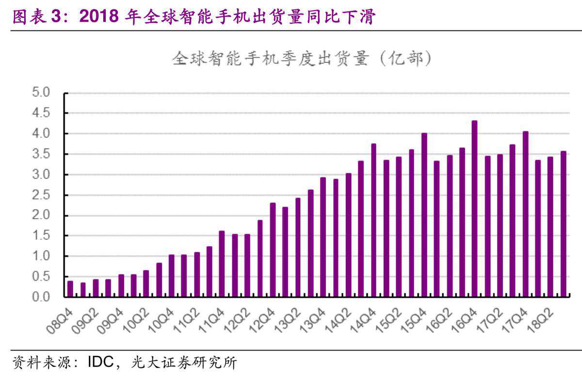 反映到细分行业上,过去十年最为重要的智能手机行业也在2018年出现了出货量的同比负增长。根据IDC的数据,2018年前三季度全球智能手机出货量分别为3.34亿、3.42亿、3.55亿部,分别同比下滑2.92%、1.78%和4.80%。