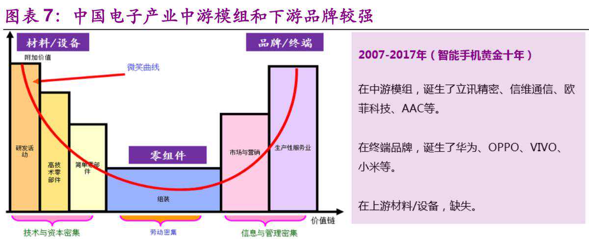 站在当前时点,我们从微笑曲线看中国电子产业:微笑曲线右边是下游终端厂商,终端品牌已经涌现了智能手机的HOV(华为、OPPO、vivo)、笔记本的联想、电视机的海信、空调的格力美的等等。微笑曲线的中间是中游模组厂商,它们代工属性较强,面板的京东方、深天马,触摸屏的欧菲科技,射频天线的信维通信,声学器件的瑞声科技、歌尔声学,玻璃盖板的伯恩光学、蓝思科技,连接器件的立讯精密,电池器件的ATL、德赛电池、欣旺达,等等,它们均在各自细分零组件领域做到全球领先。微笑曲线的左边是电子材料及设备,它们技术要求高,主要被日韩美垄断,国内处于相对弱势地位。