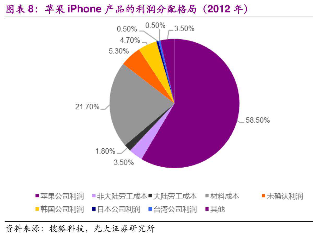 iPhone是电子产品的典范,我们从iPhone产品利润分配一窥全球各地供应格局。根据美国加州大学和雪城大学的3位教授合作撰写的研究报告《捕捉苹果全球供应网络利润》中针对2010年iPhone手机利润在世界各个国家/地区分配状况的研究成果,苹果公司每卖出一部iPhone,便独享其中近六成的利润;排在第二的是塑胶、金属等原物料供应国,占去了21.9%;作为屏幕、电子元件主要供应商的韩国,也仅分得了iPhone利润的4.7%;至于中国大陆,则只是通过劳工获得了其中1.8%的利润份额,凸显了价值链不同环节的利润分成差异巨大。虽然这是2012年的学术研究报告,但时至今日,苹果iPhone在智能手机的地位暂无法撼动,苹果全球供应链的利润分成也大致如此。附加值高、产业链话语权的供应国/供应商始终处在利润中心区域。从中国大陆的劳工仅获得1.8%的利润值就可以看出,低端锁定让大陆始终处于利润分配的末端。