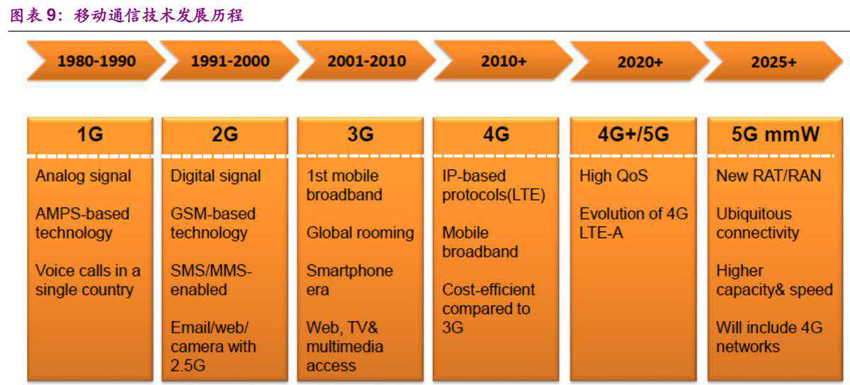 到了第五代5G移动通信时代,预计将提供比现有4G快100倍的传输速度,达到10-100Gbps,极大推动物联网、车联网、工业等领域的发展。