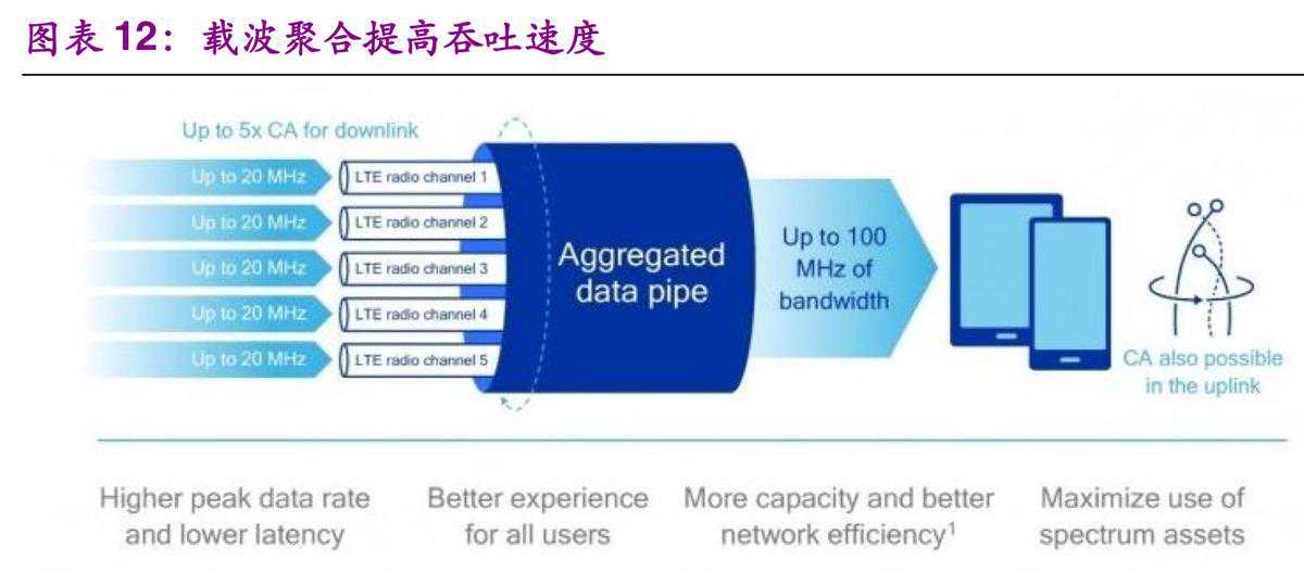 所谓载波聚合,就是同时利用多个分散的载波传输数据,使得总频谱宽度大幅提升,从而显著提升带宽的方案。4G中它的应用可以使2-5个LTE中的成员载波(带宽小,通常为20M)聚合在一起,实现最大100MHz的传输带宽。