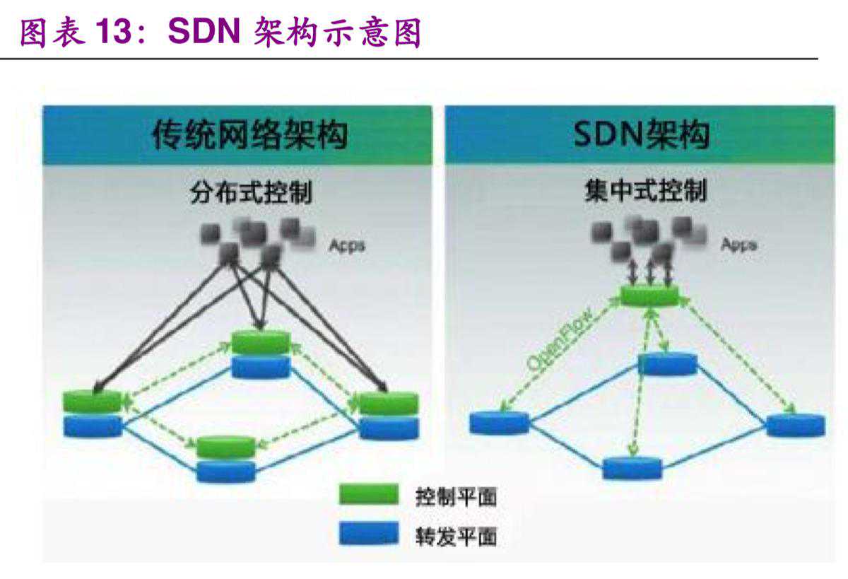 SDN,即软件定义网络(SoftwareDefinedNetwork),是一种新型网络创新架构其核心思想是将网络设备的控制面与数据面分离开来,从而实现了网络流量的灵活控制,使网络变得更加智能。SDN的核心技术OpenFlow,一方面将网络控制面板从数据面中分离出来,另一方面开放可编程借口,从而实现网络流量的灵活控制及网络功能的“软件定义”,有利于通过网络控制平台从全局视角来感知和调度网络资源,实现网络连接的可编程化。