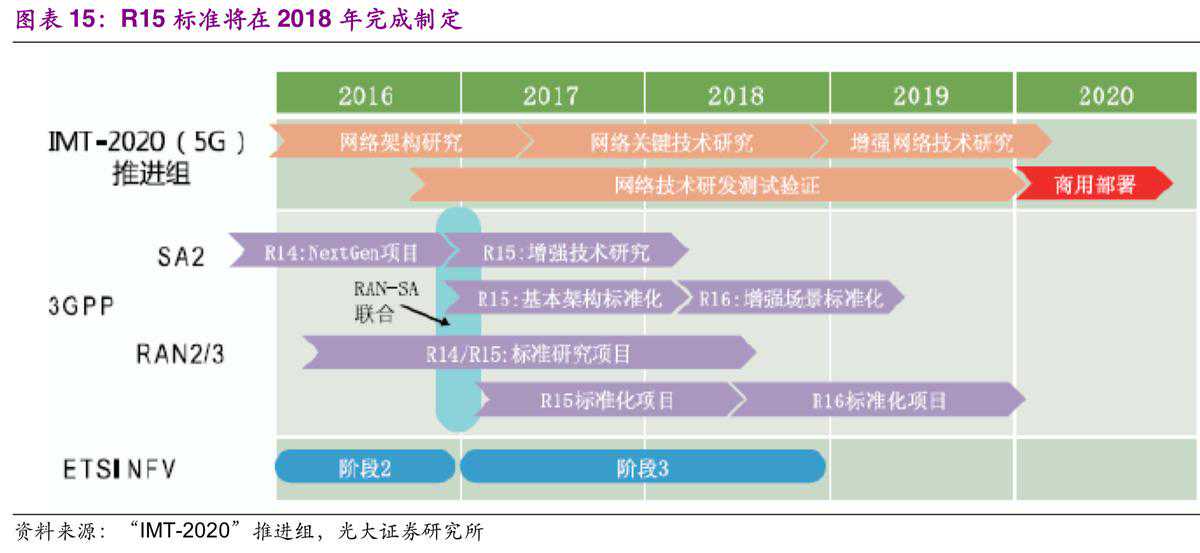 全球R15标准制定可以分为两步走:第一步已于2017年年底完成,其标志性事件为非独立组网标准的冻结。第二步以独立组网标准冻结而宣告结束。前两步完成之后,5G国际标准的大部分内容已经确定,同时产业链的相关方可以进行5G商用设备的研发定型和生产。