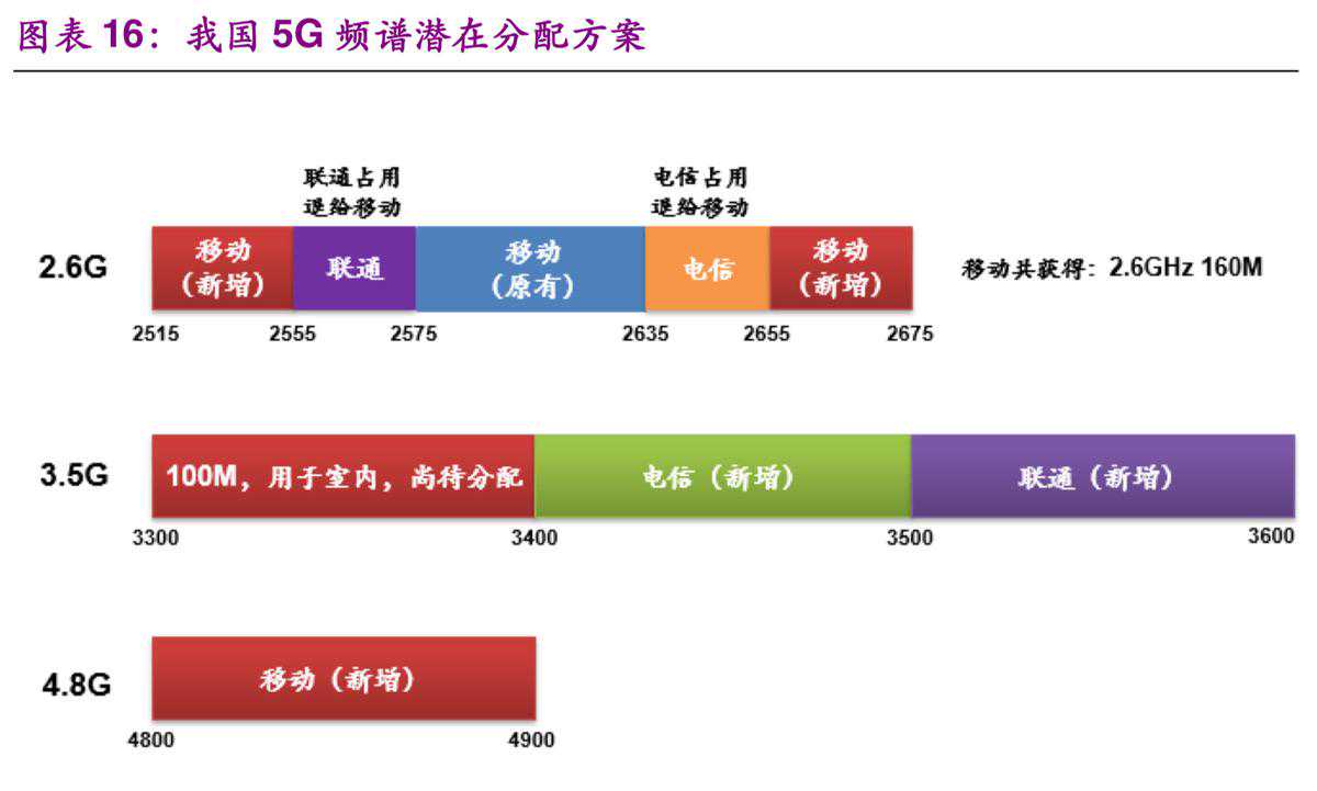 在具体频谱分配方案方面,根据工信部的规划,预计中国电信和中国联通方面将分别拿到3.4GHz~3.5GHz的100MHz带宽和3.5~3.6GHz的100MHz带宽。对于中国移动而言,中国移动将会被新分配到2.6GHz频点附近100MHz带宽以及4.8GHz频点附近频段。