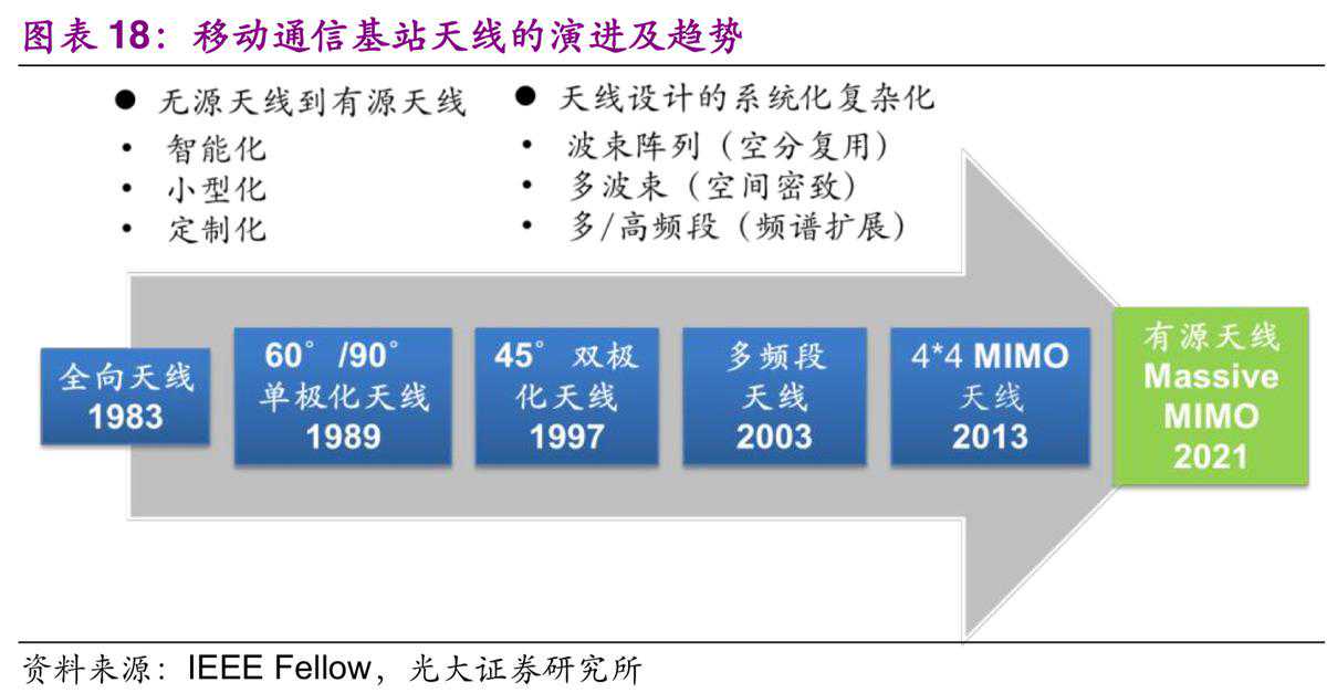 基站天线是通信信号收发的关键设备,通常来讲主要由四个部分构成:保护内部组件的天线罩、用来发射信号的辐射单元(天线振子)、作为底板以及反射辐射信号的反射板、用来功率分配的馈电网络。从1G时代的全向天线,到2G时代的定向天线,再到3G时代的多频段天线,再到4G时代的MIMO天线,基站天线技术一直在不断演进。整体而言,基站天线的演进过程就是从单个阵列的天线,到多阵列再到多单元;从无源到有源的系统;从简单的MIMO到大规模MIMO系统;从简单固定的波束到多波束。到了5G时代,因为5G通信使用了更高频段、并采用高阶MIMO、BeamForming技术,这就导致无论是宏基站还是微基站天线都将进一步出现明显技术升级。从目前可见的发展趋势上看,基站天线呈现了两大明显的趋势:第一,从无源天线到有源天线系统。第二个趋势是天线设计的系统化和复杂化。
