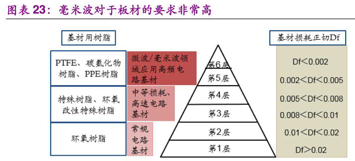 除了用量的增加,由于5G使用了一系列新技术,所以会带来PCB技术复杂度的提升,带来价值量的大幅增加。首先是PCB层数会得到大幅提升。从4G到5G,由于通信频段的大幅增加,通信信道数量会大幅增加,4G通常为16个信道,而5G会达到128甚至196个信道。信道的增加需要PCB拥有更为复杂的电路结构,将使得PCB层数从12层上升至20层左右。层数的增加意味着制造难度的增加,价值量和利润率都将得到提升。除了天线,在OTN网中的单板和背板层数也将大幅增加,单板层数将从4G的18-20层增加值5G的20-30层,背板层数将从4G的30-40层增加至5G的40-50层。其次是PCB的板材用料需要使用高频高速板,带来价值量的大幅提升。与信号传输性能相关的两个指标为介电常数Dk和介质损耗Df。Dk决定了信号传输速度,Df则决定了信号传输的损耗。目前常用的PCB板材为FR-4,其Dk为4.2-4.7,Df超过0.01,在高速高频电路中损耗较大。
