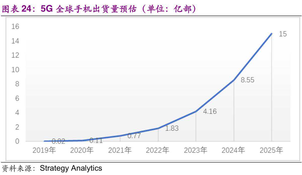 5G被誉为智能手机下一波换机浪潮主要推动力量,在智能手机创新乏力之际,全球主流的手机厂商都将目光瞄准了5G。华为公布了5G产品线路图,旗下首款支持5G的手机将会在2019年下半年正式发布。三星集团计划在未来三年内投资约25万亿韩元(220亿美元)进入人工智能(AI)、第五代移动网络技术(5G)、未来汽车和生物制药的电子元件,首款5G手机将于2019年一季度亮相。OPPO与中国移动合作“共同确保我们在2019年领先发布可商用的5G手机,为用户带来极致的5G终端体验。”小米官方称小米手机已成功打通5G信令和数据链路连接,为2019年正式推出5G手机打下了坚实基础。可见,各大手机都在为5G手机的推出做了充足的准备。根据StrategyAnalytics最近的研究,2019年全球5G智能手机出货量估计将达到200万部,2025年,将达到15亿部,年均增长率超过250%。2020年之后,5G手机渗透率将快速提升。