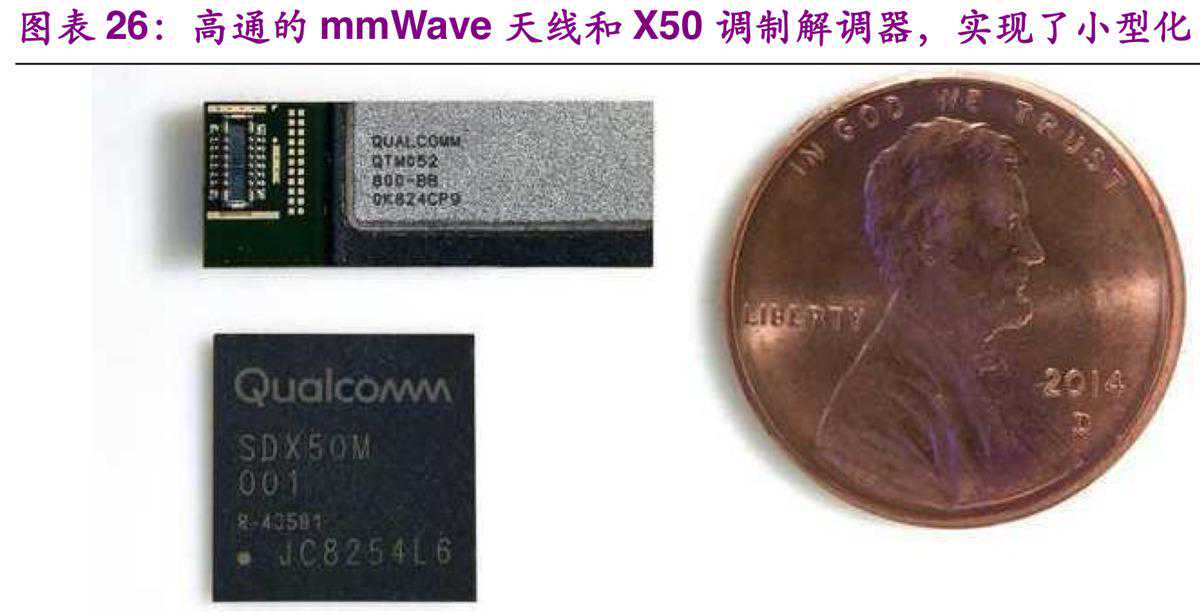 (低于6GHz)频段,手机天线设计的主要挑战基本上是来自于“量的增长”,如无线通信频段数量的增长及天线数量上的增长。然而,到了5G毫米波频段,手机天线设计从单天线且波束固定的天线设计,转变为天线阵列(多天线单元)的设计,同时还是可波束赋形(BeamForming)的阵列设计,这对手机天线设计来说是“质的跳跃”。毫米波天线阵列较为主流的方向是基于相控阵(phasedantennaarray)的方式,主要分为三种:AoB(AntennaonBoard,即天线阵列位于系统主板上)、AiP(AntennainPackage,即天线阵列位于芯片的封装内),与AiM(AntennainModule,即天线阵列与RFIC形成一模组)。这三种方式各有优劣,目前更多的是以AiM的方式实现,其设计重点主要有:天线阵列(包含feedingnetwork,即馈入网路)的设计与优化能力、板材(substrate)与涂料(coating)的选择与验证能力、电气系统与结构环境的设计与优化能力、模组化制程的设计与实现能力,与软件算法的设计与优化能力等。2018年,高通就展示了世界上第一款完全集成、可用于移动设备的5G毫米波(mmWave)天线模块和sub-6GHz射频模块。高通的QTM052mmWave天线模块和QPM56xxsub-6GHz射频模块都是为了配合高通的SnapdragonX505G调制解调器使用,帮助处理不同的无线电频率。