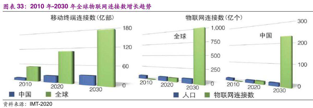除了手机,5G更广阔的应用是在物联网。海量物联网可以支持资产跟踪、智能农业、智慧城市、能源/公用事业监控、实体基础设施、智能家居和联网购物等各种。据中国物联网研究发展中心预计,到2018年,物联网行业市场规模预计将超过1.5万亿元,2020年我国物联网产业规模将达到2万亿。根据IMT-2000(5G)推进组数据,预计到2020年,全球移动终端(不含物联网设备)数量将超过100亿,其中中国将超过20亿。全球物联网设备连接数也将快速增长,到2030年,全球物联网设备连接数将接近1000亿,其中来自中国的连接量超过200亿。