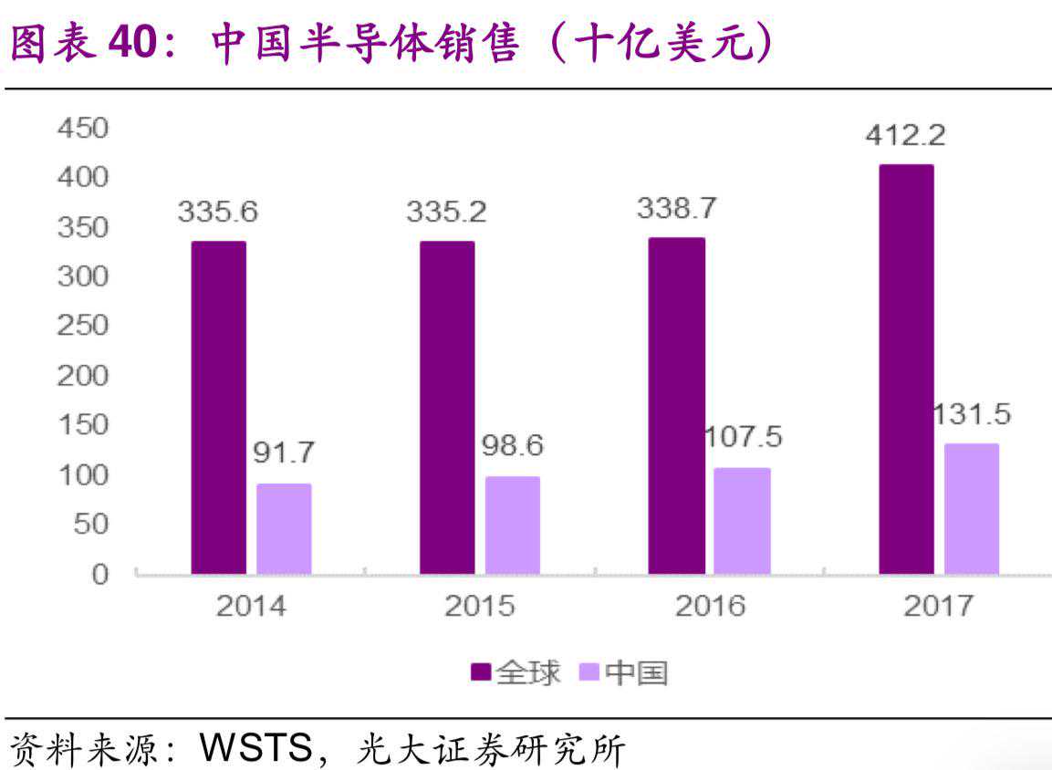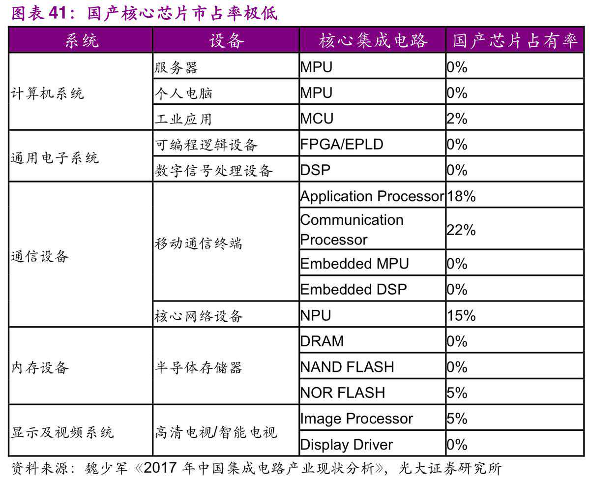 我国半导体市场虽大但自给率低。我国2014及2015年芯片进口均超过2000亿美元,成为中国进口量最大的商品。根据ICinsights数据,2016年中国公司仅能满足本土15%左右的芯片需求。在高端芯片市场上,服务器MPU、桌面计算机MPU、工业控制用MCU、可编程逻辑器件FPGA、数字信号处理器DSP,手机芯片中的用到的嵌入式CPU、嵌入式DSP、动态随机存储器DRAM、闪存FLASH、高速高精度转换器AD/DA、高端传感器Sensor等基本上全部依赖国外,我国产品的市场占有率几乎为0。