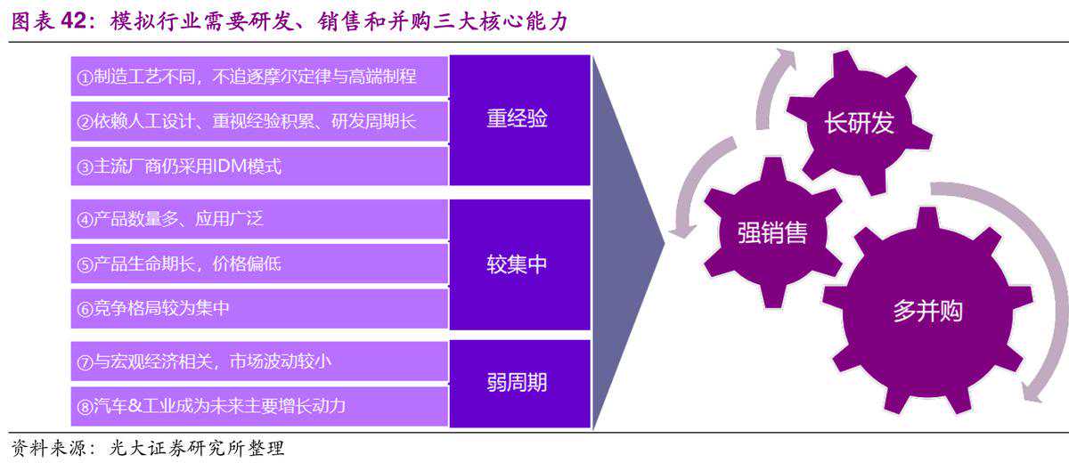 模拟芯片方面,根据WSTS数据,2016年中国模拟芯片市场规模达到1994.9亿元,占全球模拟芯片销售额的62%,但前五大厂商全为欧美跨国公司,进口替代空间巨大。模拟芯片行业的特点有:不强调摩尔定律与高端制程;依赖人工设计、重视经验积累、研发周期长;品种类繁多、产品应用广泛;产品生命期长,价格偏低;市场波动较小;汽车工业应用成为未来主要增长动力。随着模拟代工兴起,大陆产业生态发展逐渐完善。国内厂商紧抓产业变迁机遇,拓展本土需求,从低端向中高端渗透。对于已实现技术突破的低端市场,考验的是销售能力;而对于未实现技术突破的高端产品市场,考验的是研发能力。并购重组则是实现弯道超车的不二法门。圣邦股份是国内模拟IC龙头,韦尔股份是国内优质经销+设计厂商,有望率先受益于大模拟行业发展。