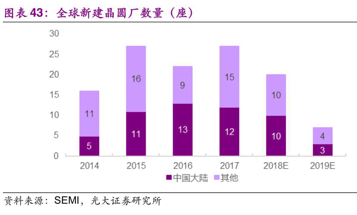 制造向国内转移,新建晶圆厂迎来产能释放期。根据SEMI预计,在2017年至2020年期间全球将新建62座晶圆厂,其中中国大陆将新增26座晶圆厂,约占全球总新增晶圆厂的42%。