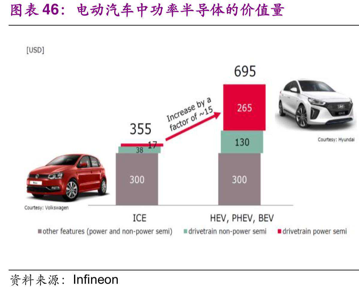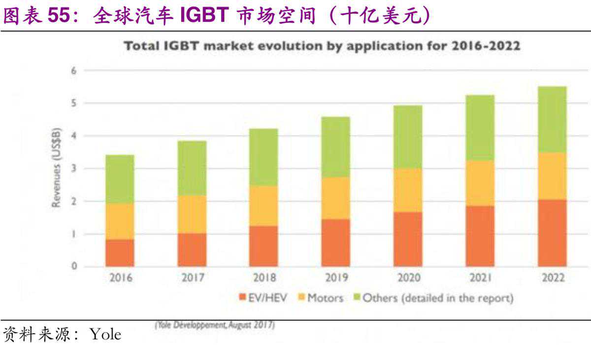 IGBT是汽车功率半导体中重要的组成部分,是能源变换与传输的核心器件,俗称电力电子装置的“CPU”。在电动汽车中,IGBT占整车成本的7-10%,是除电池之外成本最高的元件。2016年全球电动车销量为247万辆,共消耗了大约9亿美元的IGBT管,平均每辆车大约450美元。其中,混合动力和PHEV大约77万辆,每辆车需要大约300美元的IGBT,纯电动车大约123万辆,平均每辆车使用540美元的IGBT,大功率的纯电公交车用的IGBT超过1000美元。根据Yole数据,2018年电动车用IGBT市场规模超10亿美元。