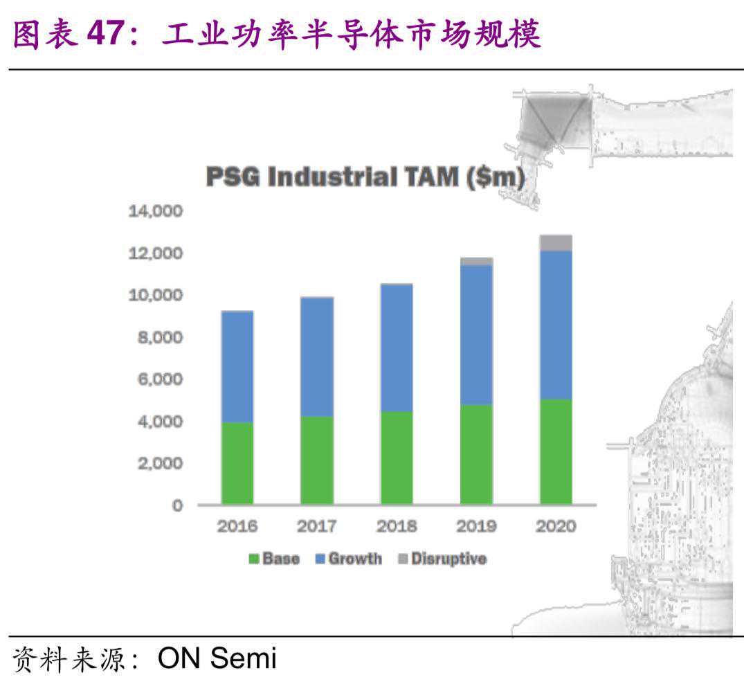 功率器件行业在3C应用市场放缓的同时,汽车和工业成为未来主要增长动力。据Yole数据,2017年全球功率半导体市场规模超300亿美元。根据Infineon预估,汽车中功率半导体量价齐升驱动汽车对功率半导体需求中长期增速约为8%。根据ONSemi报告,2016年全球工业功率半导体市场规模约为90亿美元,预计2020年有望达125亿美元,年复合增速约为9%。