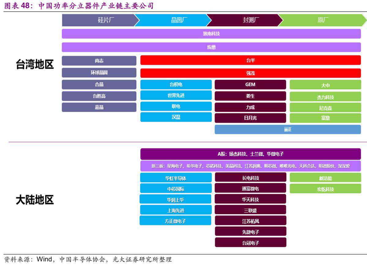 台湾地区的功率分立器件产业较为完善,有实力的厂商数量众多。近年来,大陆功率分立器件厂商在研发设计、生产制造和封装测试等方面都取得了长足的发展。