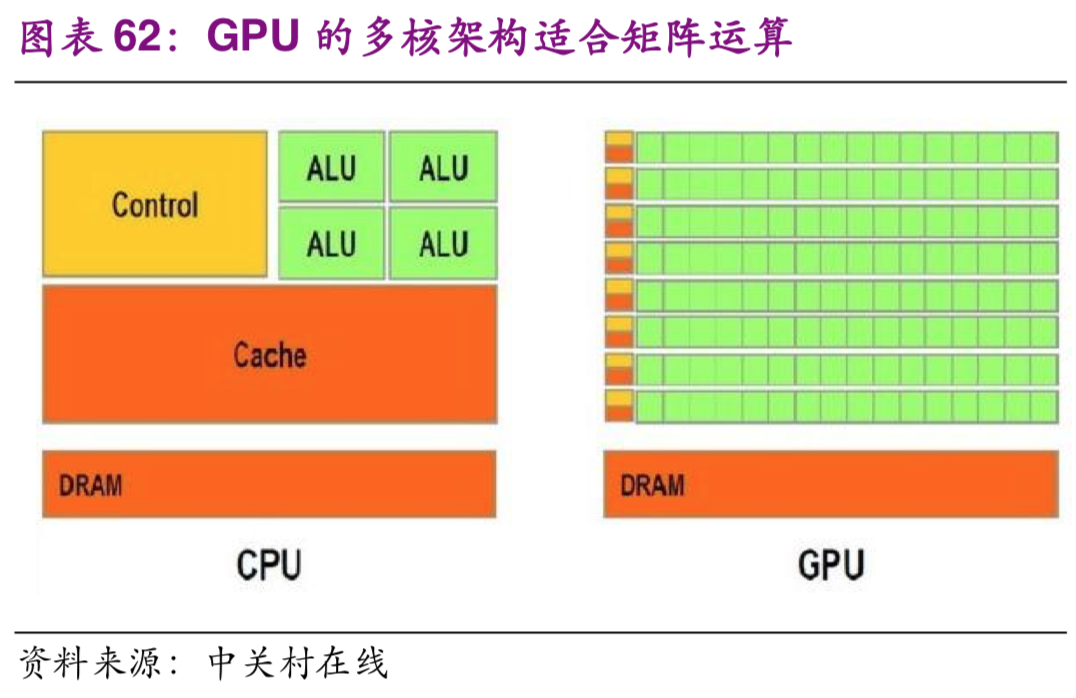 能力,并且这样的计算是以矩阵的形式进行的,而GPU(图形处理器)正好可以满足这两大要求。首先GPU的计算性能仍在以每年50%的速度增长,这远远超过了CPU每年10%的性能提升;其次GPU使用多核心架构,非常适合于进行矩阵运算。前文提到的Hinton2012年在ImageNet竞赛中的优异表现,就是使用GPU进行训练,并因此让英伟达(Nvidia)意识到了GPU计算的巨大潜力,从而发力成为人工智能芯片的领头羊。目前GPU已成为各大云服务商提供深度学习训练服务的首选。