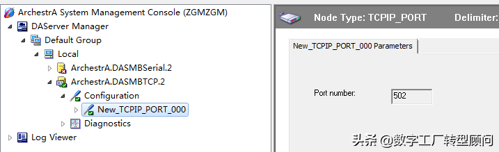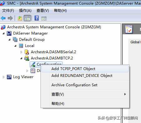 步骤2:建立通信设备:在configuration上右键添加TCPIP_PORT对象,通信端口参数默认