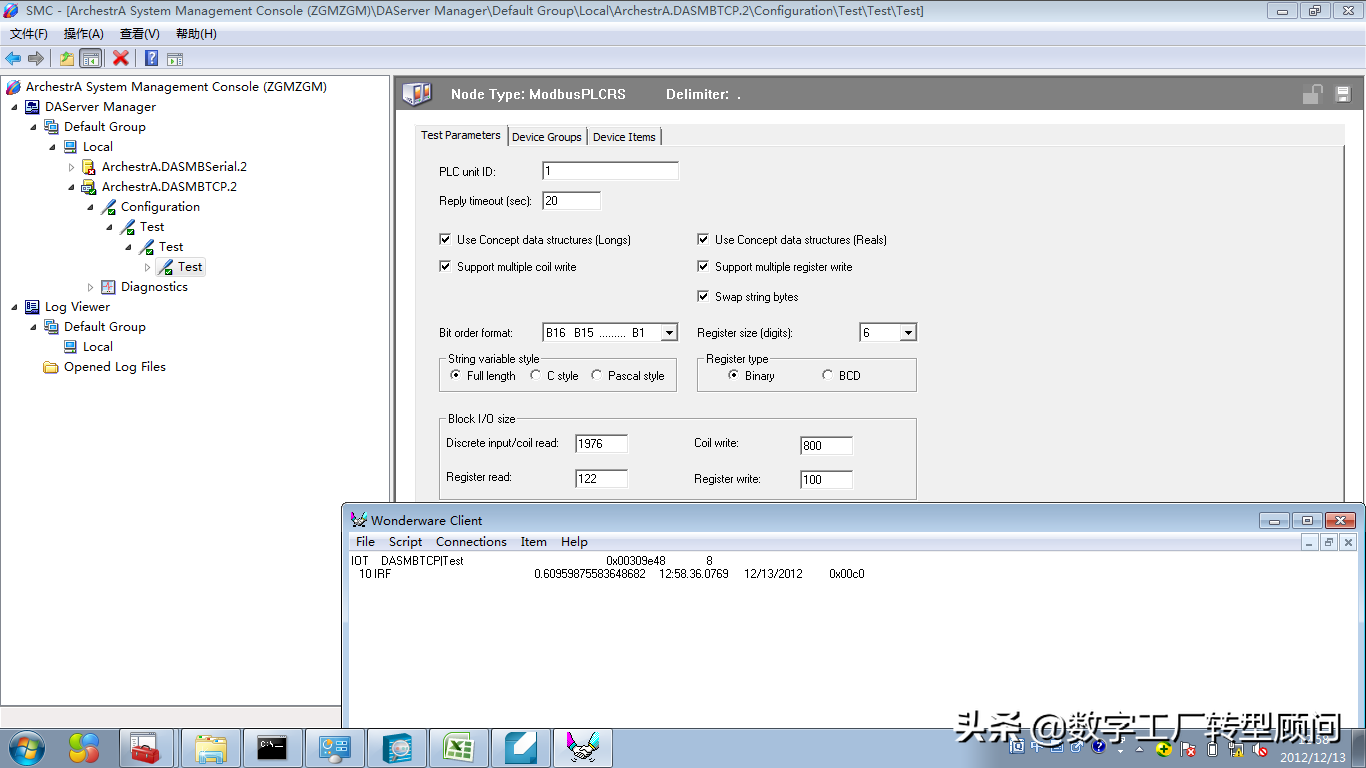 步骤5:实际测试:在WWClient中新建通信通道,根据Modbus功能码建立Item,其中03功能码对应的item命名方式:偏移量+空格+HR+数据类型,诸如0HRF;04功能码对应item命名方式:偏移量+空格+IR+数据类型,数值存储于双字节内,WWClinet设置成首地址即可(类似于PLC),诸如0IRF、2IRF