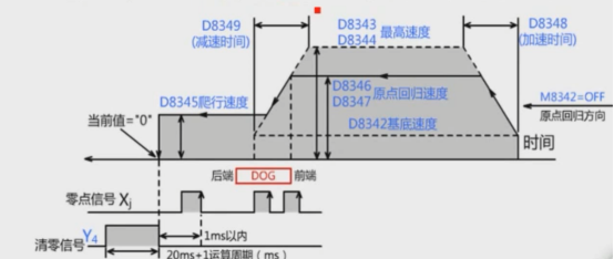 当收到Xi近点信号,触发降速到爬行速度,进入DOG区,再接触到零点信号Xj后停止运行。