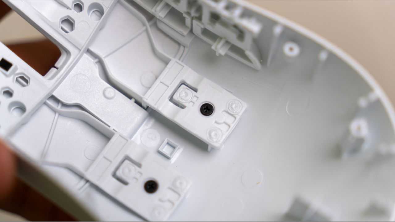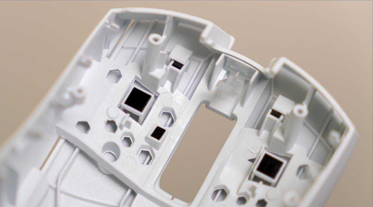 鼠标上盖被尼龙中框固定,这样整只鼠标的所有受力都会被均匀的分散到中框上,使得在外壳极薄的情况下依然维持了不错的刚度。