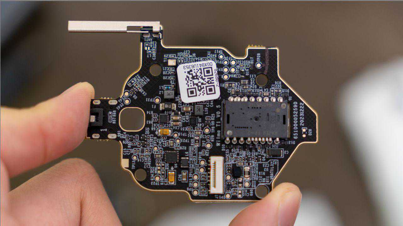 PCB角落能明显的看出一条单独引出来的无线天线,保证信号传输的稳定性。PCB上元器件密度极高,空缺部分有做挖孔减重设计,在周围还有一圈沉金抗干扰。