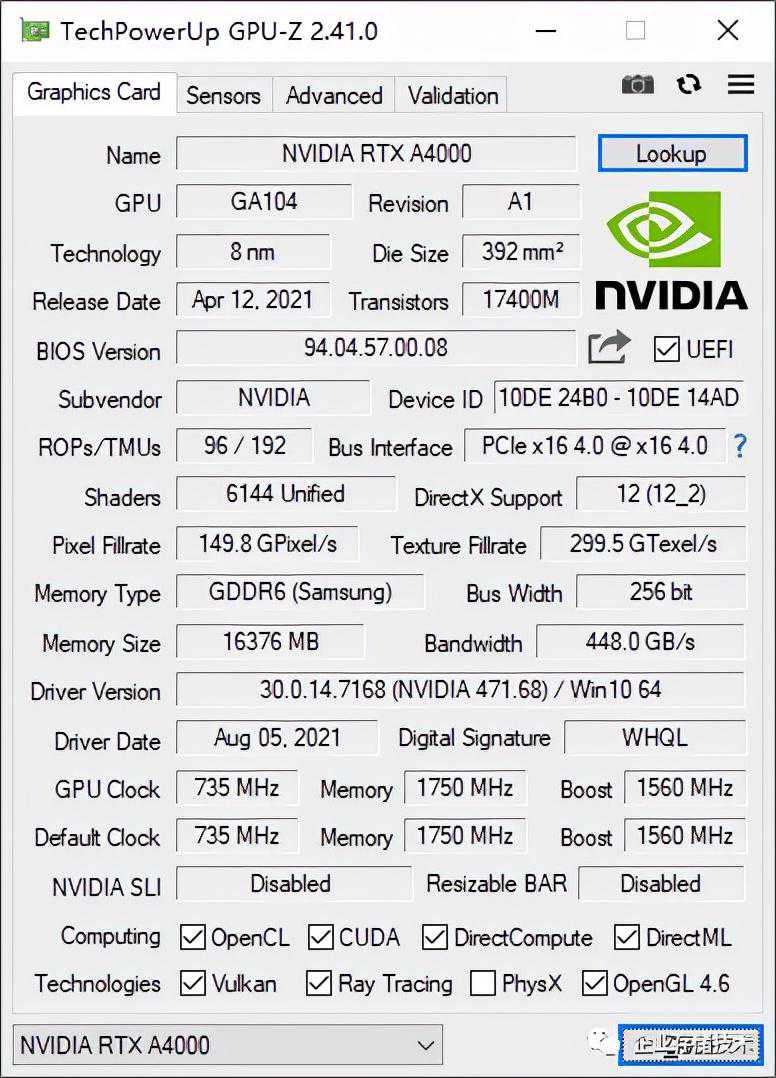 我第一次在平台上的显卡测试。上图中RTXA4000的具体规格,我会在下文中对比分析。