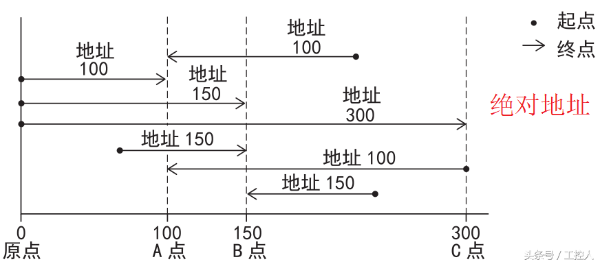 所谓的绝对方式就是以原点为基准指定位置(绝对地址)进行定位,起点在哪里都没有关系,就是说与现在我停在哪地方无关,只与原点做比较,比如我现在在100的位置,我们输入100,是不会动的,输入500,会向前走400,输入-500,会向后退600,因为只和原点做比较,现在在100的位置,输入100与原点比较无变化,输入500,源原点做比较还差400,所以往前走400,输入-500,与原点比较,发现不仅要走100回到原点还要往回再走500加起来就是600。