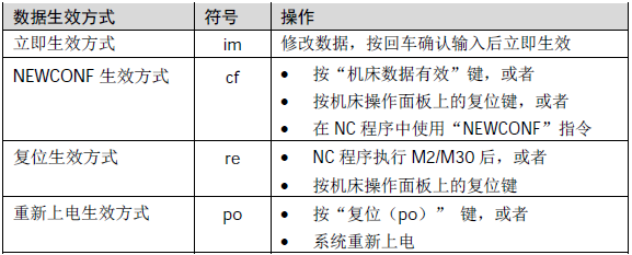 不同的机床数据和设定数据,有不同的生效方式,如下图方框标记出的数据生效方式列