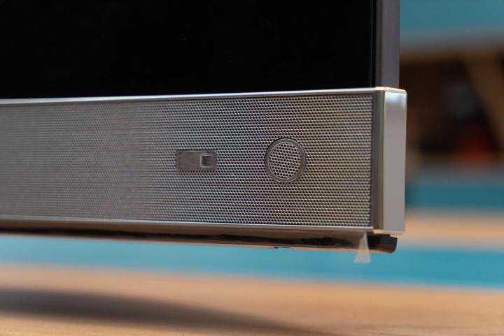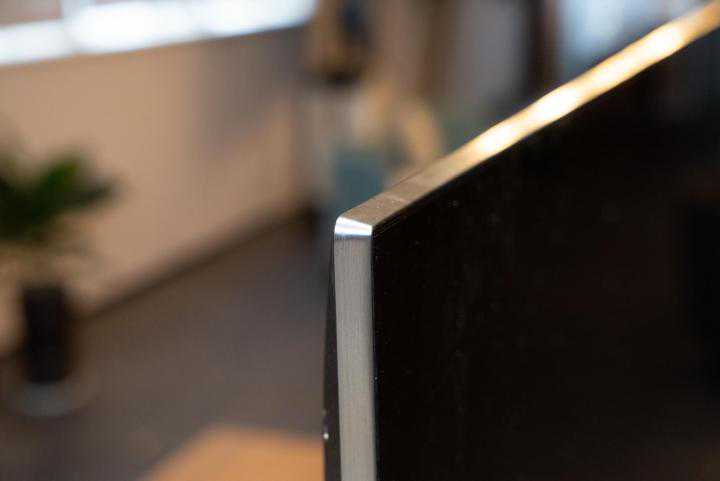 电视的侧边框使用的是银色金属拉丝材质一体折弯工艺。不得不说,银黑色的搭配放在哪都很好看。