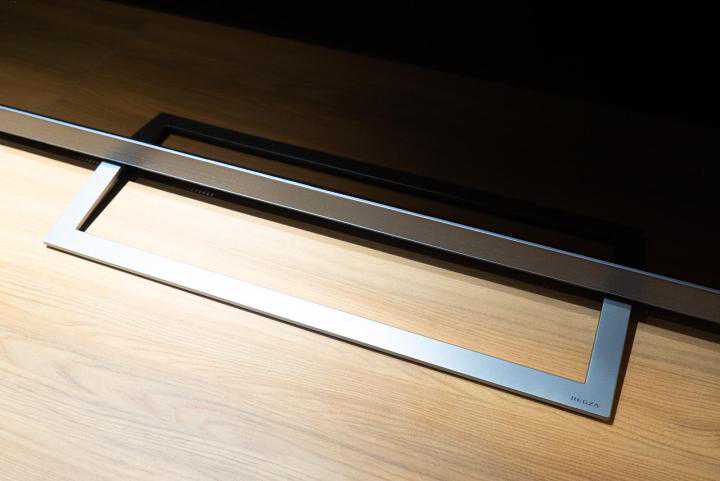一体化的底座设计,非常简约纤薄,并且仅仅将电视提高了大约2-3cm。优点是座式安装高度能更低,不过缺点是电视机前不能堆杂物……